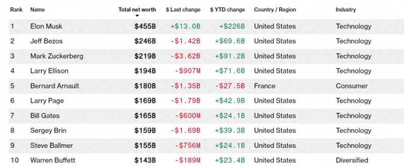 全球十大富豪排行,9个都是美国人:马斯克身家突破4500亿美元站稳第一
