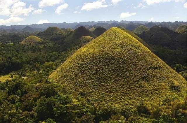 - 菲律宾巧克力山:位于菲律宾保和省,由1268个面积相同、几近完美的圆锥形山丘组成,占地达50平方公里,其形成原因有多种说法。