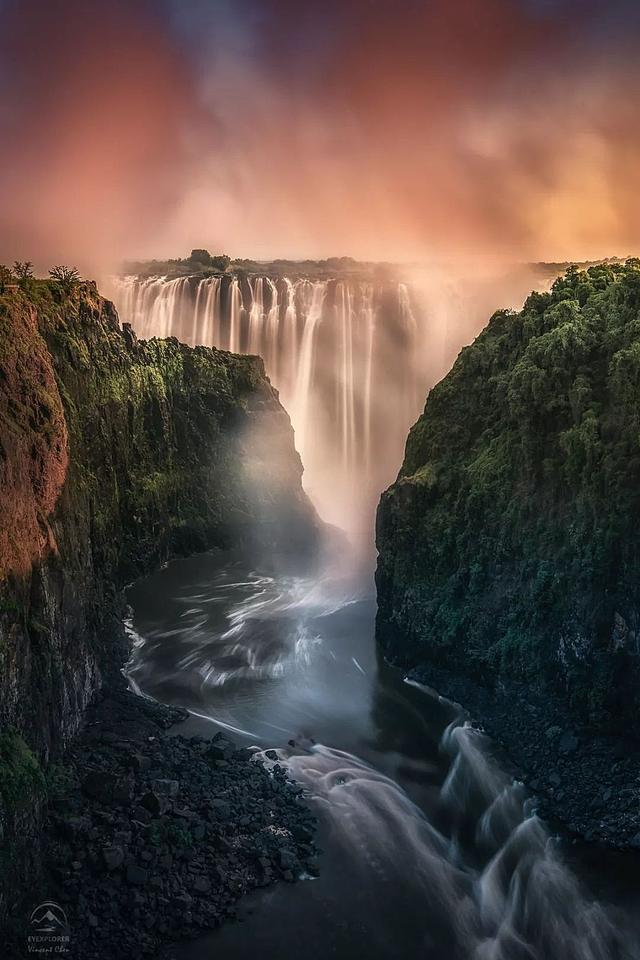5. 非洲维多利亚瀑布:“雷霆之雾”名不虚传,宽1708米的单体瀑布落差108米,水流倾泻时轰鸣震耳,水雾升腾如云海,20公里外可见彩虹,野性又壮阔。