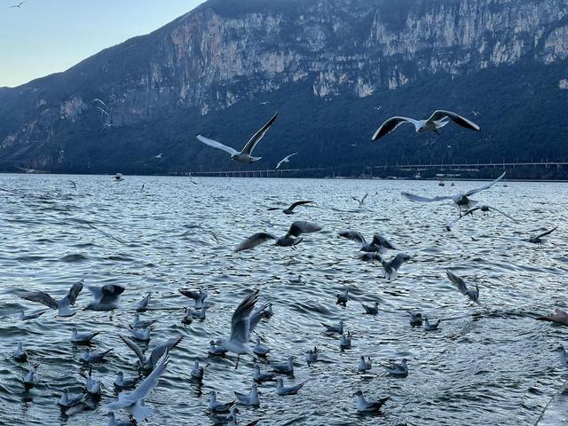 滇池宽得像海,冬天海鸥来开会,手里一块小面包,鸟就排队领。