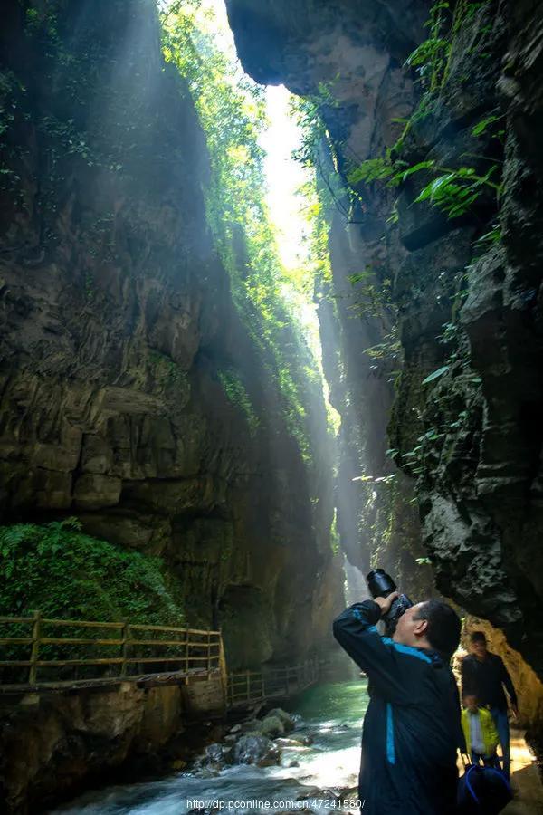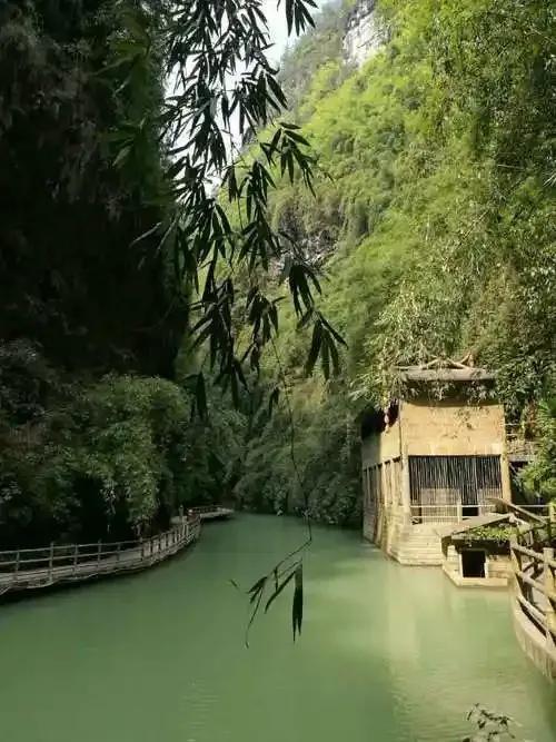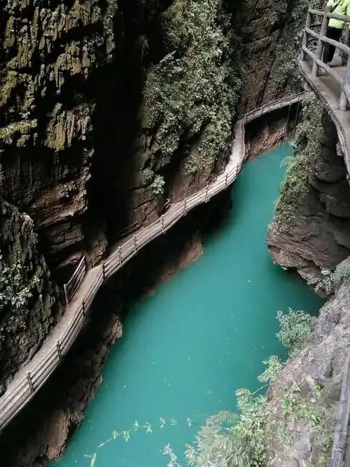 藏在彭水深处的“地缝奇观”!谷底河水是碧蓝色,两边悬崖高上百米,抬头只看得到一线天。走完栈道可以坐竹筏漂流,撑船的大叔会唱土家山歌,歌声在峡谷里回荡好久。