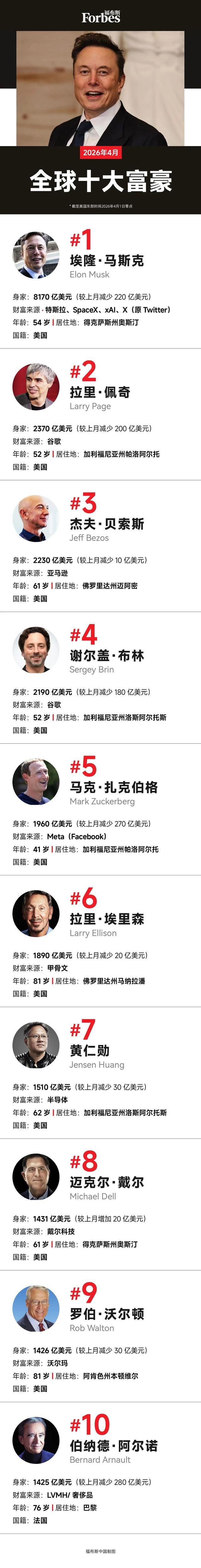 《福布斯》自1987年起持续追踪全球亿万富豪。2026年3月,我们的年度榜单共统计了3428名亿万富豪。(以下是根据《福布斯》统计,截至2026年4月1日美国东部时间零点的全球十大富豪。由于股价时常波动,富豪们的身家可能每天都在变化。《福布斯》另有实时富豪榜追踪他们的每日财富变动。)