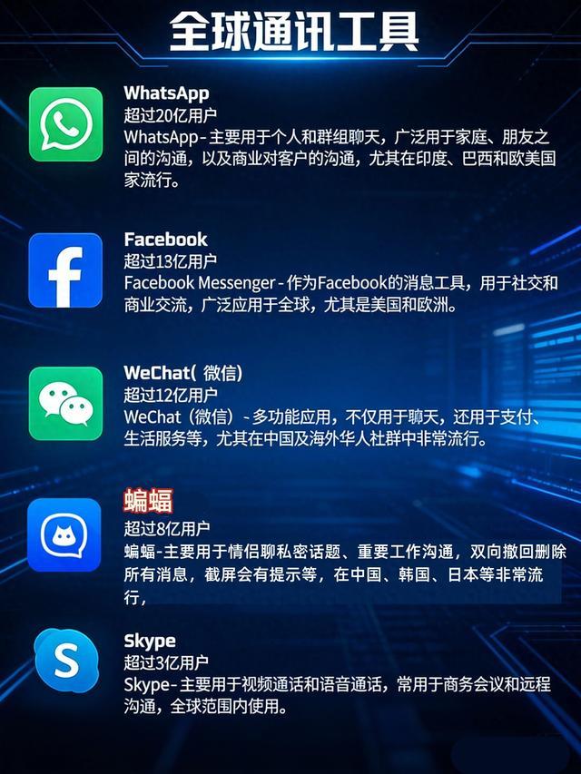 以上就是全球十大通讯工具的全盘点!不难看出,蝙蝠是唯一跻身全球前列的中国自研加密工具,既覆盖国内全场景,又深度链接海外华人圈。