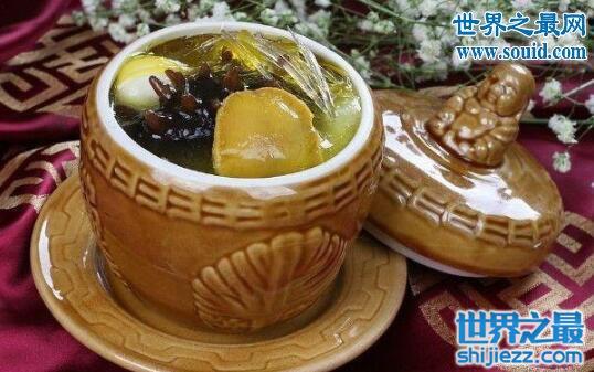 在伦敦的一个中餐馆,如果你愿意拿出190美元,便可品尝到全世界最昂贵的汤——佛跳墙。烹制佛跳墙选用的食材包括鱼翅、鲍鱼、日本花菇、海参、干贝、鸡肉、湖南火腿、猪肉和高丽参。如想品尝这道天价汤,食客需提前5天预定。