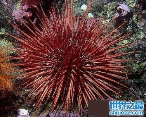 红海胆又名巨紫球海胆,只能在太平洋中发现它们的踪影,主要生活在北美的西海岸沿岸。它们生活在浅滩区域,有时候是岩石上,或者低潮线向下90米的水中。它们把自己的体刺用作高跷在海底爬行。一些个体红海胆的寿命超过了200年。
