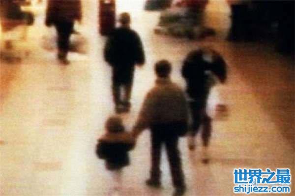 这个在英国利物浦一家购物中心监视器拍下的影像,是一名10岁小男孩牵着一名2岁的幼童(詹姆士),这也是小詹姆士生前最后一张照片。这名2岁幼童随后被照片中的10岁男孩罗伯特‧汤普森以及另一名10岁同伙乔恩‧维那波尔思谋杀,他们在铁轨旁用砖头、铁棍殴打致死,最后将他放在铁轨上让火车辗过,引起社会震怒。这名10岁男孩成为20世纪被定罪谋杀年纪最小的罪犯。