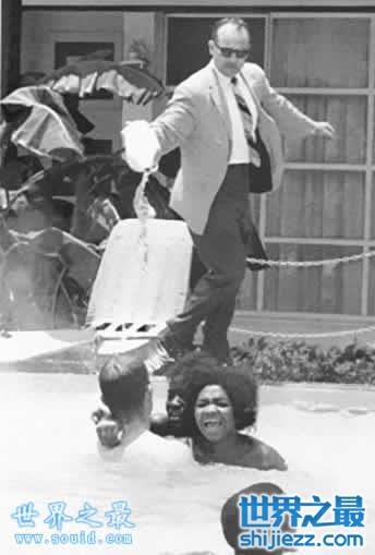 在饭店泳池边,有种族歧视的饭店主人用盐酸泼洒在游泳池中的黑人。