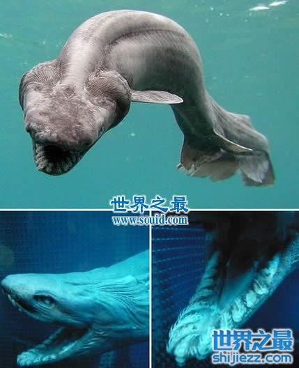 皱鳃鲨(念zou sai sha)又名拟鳗鲛,是鲨鱼类最原始最古老的一种,有“活化石”之称,一般体长。从图中可以看出,其外形十分丑陋恐怖,身体两侧有六条鳃裂,鳃间隔延长而褶皱,且相互覆盖,所以命名为皱鳃鲨。