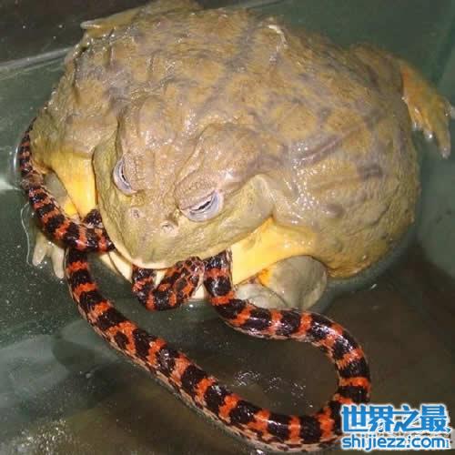 据说这种非洲牛蛙极具进攻性,跳起来可达到两米。它们的捕食方式,通常是蹲在一个地方不动,等待猎物自动出现,然后迅速上前ko之。