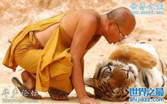 泰国一寺庙的部分僧侣为保护濒危动物,与老虎共享庙宇,给它们提供了一个栖息场所。僧侣们与这些老虎关系和谐,远道而来的游客都为这一幕惊诧不已。