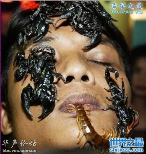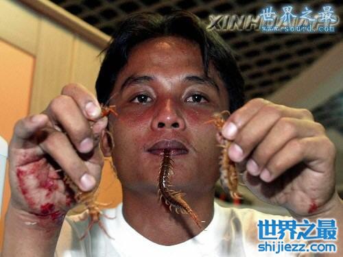 泰国男子汶他维曾在一间玻璃房子里与1000只蜈蚣同居28天。据悉,汶他维是一名专业的蜈蚣表演者,他在向前来观看的人表演与蜈蚣、蛇、蝎子等动物友好相处的情形时,引得围观者发出阵阵尖叫。