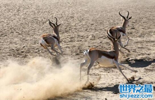 跳羚和叉角羚一样,敏锐的感官使得跳羚十分机警。一旦受刺激,跳羚奔跑时的速度可以达到60英里每小时。这也使得他们成为世界十大速度最快的动物中,跑的最快的哺乳动物。跳羚因其可以腾空起跳达到9英尺而得名。跳羚可以实现腾空跳跃13英尺的壮举。屈体、绷紧四肢、头抵地,起跳、落地,跳羚不断重复着这一系列的动作。