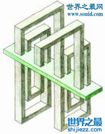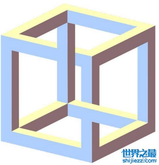 就是在这个立方体中某一条应该靠近观察者的棱 神奇地被一条应该远离观察者的棱挡在了更远处,使人产生错觉, 它在现实世界是不可能客观存在的,是一个不可能图形。