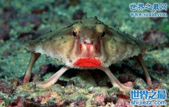 红唇,顾名思义,嘴巴是红色,身体成梭子蟹一样,更特殊的是它有四条“腿”,用胸鳍在海底“行走”,样子还是不错的。不过看鼻子和眼睛就有点蛤蟆的冲动。蝙蝠鱼大部分为深海鱼,可利用臂状胸鳍及小腹鳍爬行于海床上,亦可利用吻触手诱捕猎物,以小鱼及底栖无脊椎动物等为食。