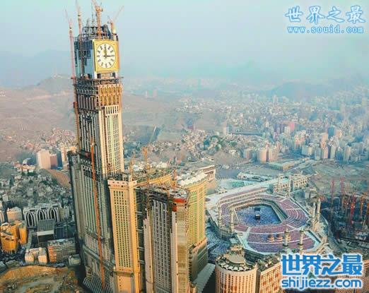 麦加皇家钟塔饭店是一栋位于沙特阿拉伯王国的伊斯兰教圣城麦加的复合型建筑。建筑高度601米,共120层。建筑整体于2004年开工,是目前世界第六高楼,世界上最高的酒店。它距离世界最大的清真寺“禁寺”咫尺之遥,这座五星级酒店为每年来圣地麦加朝圣的信徒提供服务。最高处是用黄金制做的一弯新月。在饭店400米处安装有四面钟,每个表盘的直径达40米。面向禁寺一面的大钟,高80米,宽65米,比英国伦敦国会大厦顶上著名的“大本钟”大6倍。钟面上用黄金镶嵌着“安拉至大”的阿拉伯文,每天五次礼拜时间报时。每逢重大节庆和大朝时,从钟塔上发射16条光柱,向天空直射10公里高,光彩多目。