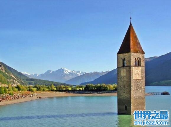 雷西亚湖位于意大利北部的南蒂罗尔,是1950年创建的一座人工湖泊,原本的村庄被湖水覆盖仅剩下一座教堂的塔楼,当到达冬天时还可以进到塔楼。