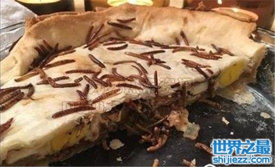 来自荷兰的黄粉虫蛋饼和上面的活蛆乳酪同出一系,将新鲜出炉的鸡蛋饼铺满面包虫的幼虫,咬下去满满的软软腻腻的高蛋白质,加上虫子外壳的酥脆,其实它的味道并不差,甚至还有科学家认为它对人的身体有益,只是它同样输在了观感上,想想那些爬在上面黄白相间的虫子,真是下不去嘴。