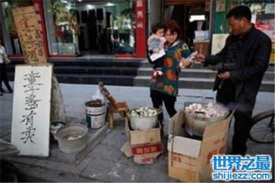 童子尿煮蛋代表中国恶心食物成功在众多恶心食物中杀出重围上榜,别看它听起来恶心,但它是浙江东阳市的非物质文化遗产,制作方法很简单,只要将鸡蛋和5岁以下男童的尿液一起煮熟就好,闻起来是普通鸡蛋的味道加上一点尿液的味道,吃起来其实只有鸡蛋的味道。