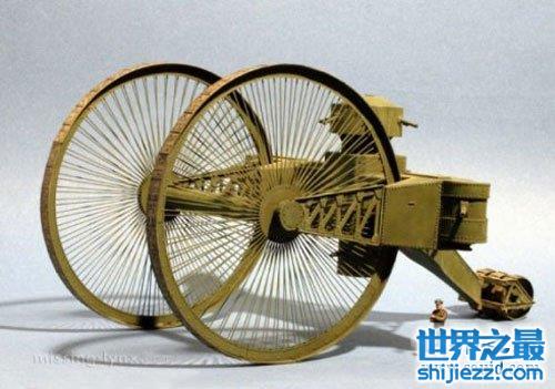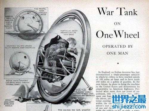 这钟独轮坦克是上世纪30年代德国人的发明。它外观呈诡异的飞碟状,不过这个“飞碟”是竖起来的,轮子就是坦克(如果这也算坦克的话)本身,侧后方两个辅助轮负责保持行驶平衡。其实这种独轮坦克的概念早在第一次世界大战之前就已经有了,可见人们的想象力之丰富。只不过由于当时技术条件的限制,并没有生产出哪怕一辆样车。