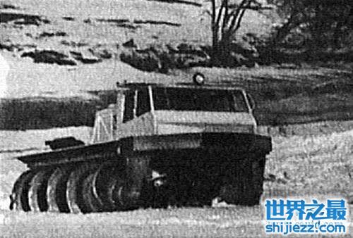 这是SHN-1型全地形车,苏联发明这种车辆是为了应对其多变的地形和恶劣的气候。这种车不用轮子也不用履带,它使用两个螺旋形的推进装置,这使得它能够跨越一般车辆难以进入的雪地、沼泽、甚至湖泊。在西伯利亚的确需要这样的车辆,但它能够做的也只有这些了。它可以走崎岖的路面却走不了平坦的路面,此外,它太笨重了,行进过于缓慢,而且它还非常费油。