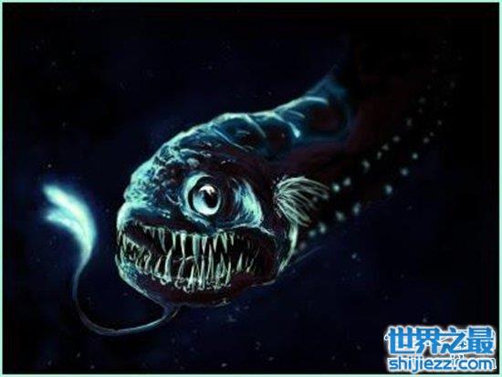 毒蛇鱼是在深海中最不常见的一种鱼,虽然它不常见并不代表它不恐怖,它长着一副大嘴和尖牙,背上具有发光的器官,正是这种发光吸引了不少小鱼靠近,毒蛇鱼的外表凶猛,常常在水中不动,等到诱饵过来再出击。