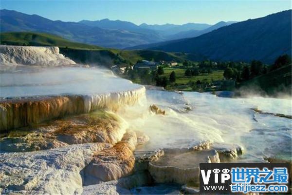 猛犸温泉是世界上已探明的最大的碳酸盐沉积温泉,其景观以石灰石台阶为主,也称热台阶区,可分为上台地和下台地。这个温泉的底部有大量的碳酸盐沉积,是美国当地最美的一个温泉,据说这个温泉非常的美丽,如同彩虹一样。