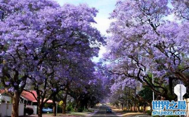 南非的约翰内斯堡拥有世界上最大的人造森林,超过一千万棵树生长在这个南非最大城市。世界上有至少49种蓝花楹,其中大部分原产于南美和加勒比海地区。图中的蓝花楹隧道位于比勒陀利亚,当地拥有70000多棵蓝花楹,盛开时使整个城市到处呈现出绚烂的紫色和蓝色。