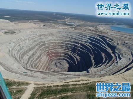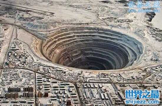米尔钻石矿坑深525米,其直径为1200米,它是前苏联最早、最大的管状钻石矿之一,也是目前世界上最大的钻石坑,目前这处矿场已被废弃。据称,在该矿场处于开采运行时,一辆卡车从矿坑底部开到顶部需要两个小时的时间。