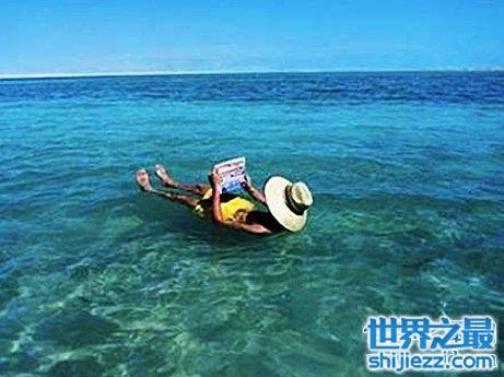 死海是世界上唯一一个人们可以浮在水上的旅游宝地,那是因为他的含盐度很高,所以可以承受住人们的体重,人们在这实现了飘在水上的愿望。但由于周围国家取水过度可能将会干旱成土地,人们将会失去一个放松身体,享受飘在水上的宝地。