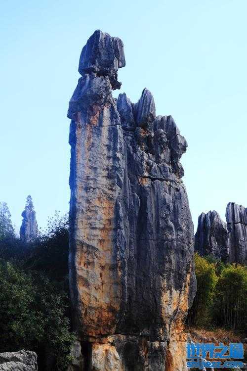 云南石林风景区地处昆明市彝族自治县内,是典型的喀斯特地貌,风景区内石林景观面积广大,有大大小小石林一千一百多平方公里,其中超过40米的石柱有三座分别是莲花峰,剑锋池,象距石。