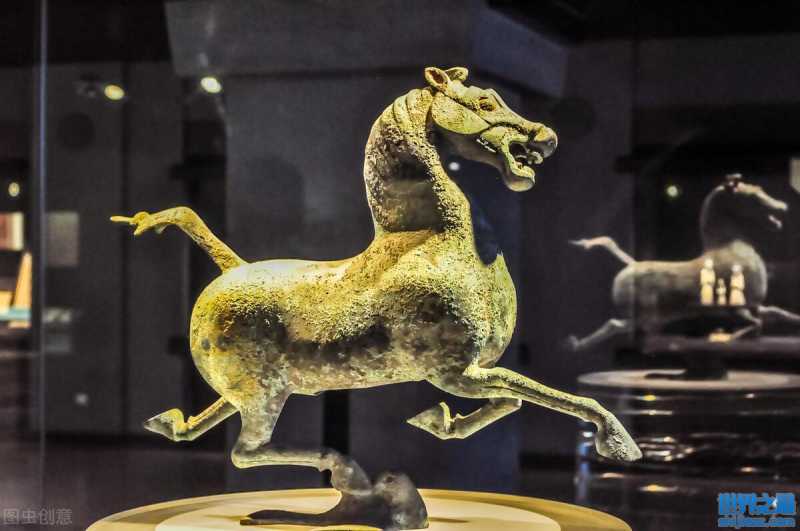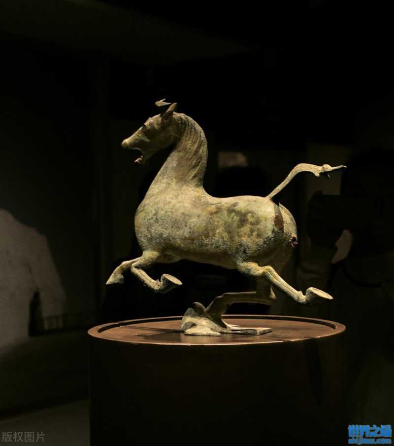 (古代中国东汉)马踏飞燕 :东汉铜奔马,别称马踏飞燕,为东汉青铜器,1969年10月出土于甘肃省武威市雷台汉墓,现藏于甘肃省博物馆。东汉铜奔马重7.15千克。形象矫健俊美,别具风姿。马昂首嘶鸣,躯干壮实而四肢修长,腿蹄轻捷,三足腾空、飞驰向前,一足踏飞燕。