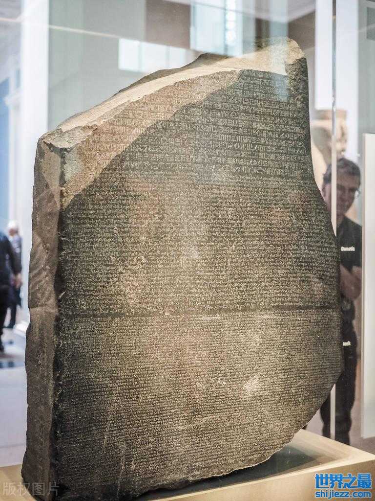 (古埃及)罗塞塔石碑 :罗塞塔石碑制作于公元前196年,刻有古埃及国王托勒密五世登基的诏书。石碑上用希腊文字、古埃及文字和当时的通俗体文字刻了同样的内容,这使得近代的考古学家得以有机会对照各语言版本的内容后,解读出已经失传千余年的埃及象形文之意义与结构,而成为今日研究古埃及历史的重要里程碑。罗塞塔石碑在1802年时运抵英国,并且以英王的名义捐献给大英博物馆作为收藏,从此之后罗塞塔石碑一直被展示在博物馆的埃及馆中,是该馆最引以为傲的镇馆之宝之一。
