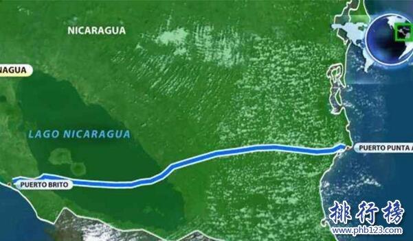 尼加拉瓜大运河美国最大的运河之一,横跨173英里,这个项目的范围是穿越尼加拉瓜的航运路线,将加勒比海和太平洋连接起来。尼加拉瓜大运河全长约276公里,是巴拿马运河长度的三倍。运河航道规划底部宽度为230米-520米,水深27.6米、航道的通过能力约9100艘/年,可通行船舶最大吨位达40万吨。运河修建期间预计创造5万就业岗位,运营期间预计创造20万就业岗位。预定2019年竣工,2020年投入使用。