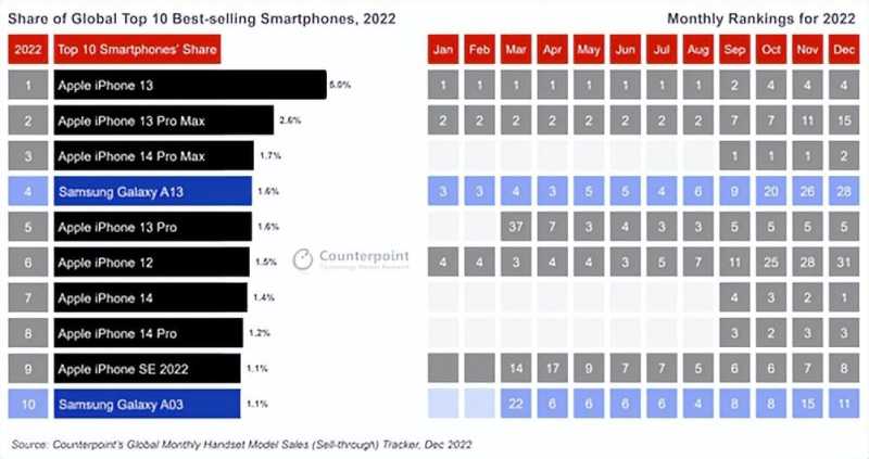 榜单按照销量数据排名,前十名手机贡献了全球智能手机总销量的 19%,与2021年相同。