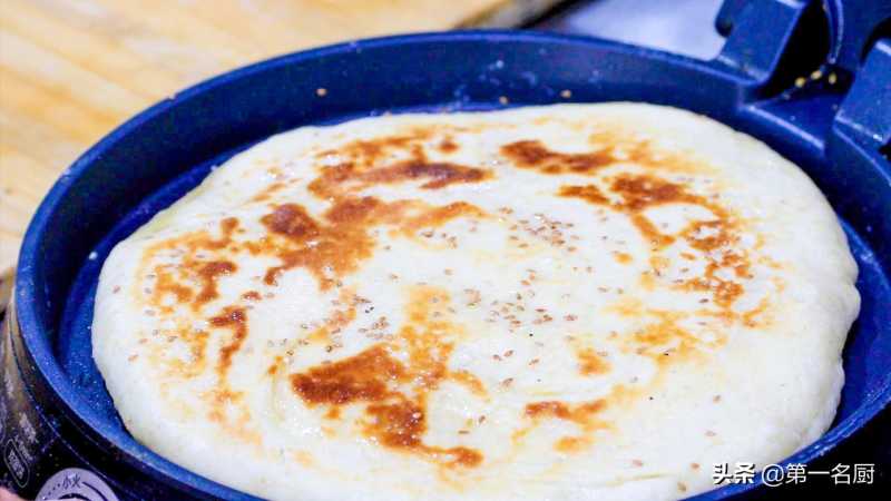 电饼铛烧热,刷上一层植物油,再把面饼摊在锅中,撒上少许白芝麻,盖上锅盖,半分钟以后翻面,煎至一面微黄色时,再翻过来煎另一面,再淋入少许植物油,继续翻面煎制,煎至面饼两面金黄酥脆时,即可取出,放在案板上。
