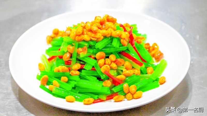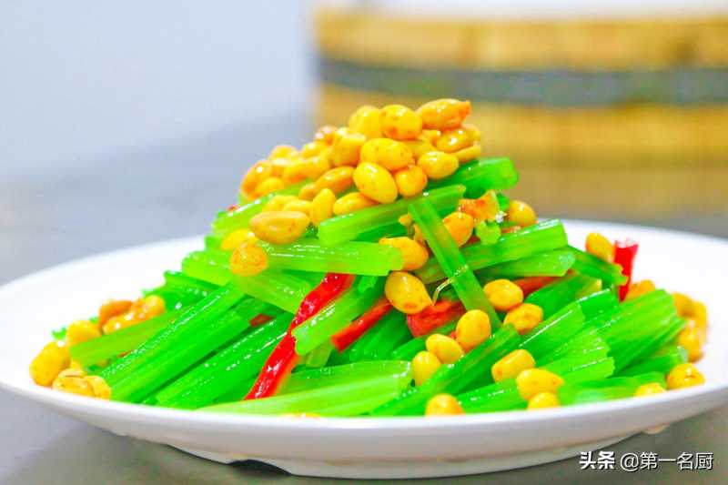 然后把芹菜倒入漏勺中控干水分,放入拌菜盆中,倒入红椒条,加入少许香油,加入白醋10克,白糖2克,食盐2克,味精1克,用筷子搅动,颠盆拌匀,装入盘中,再撒上一小把五香黄豆,美味即成。