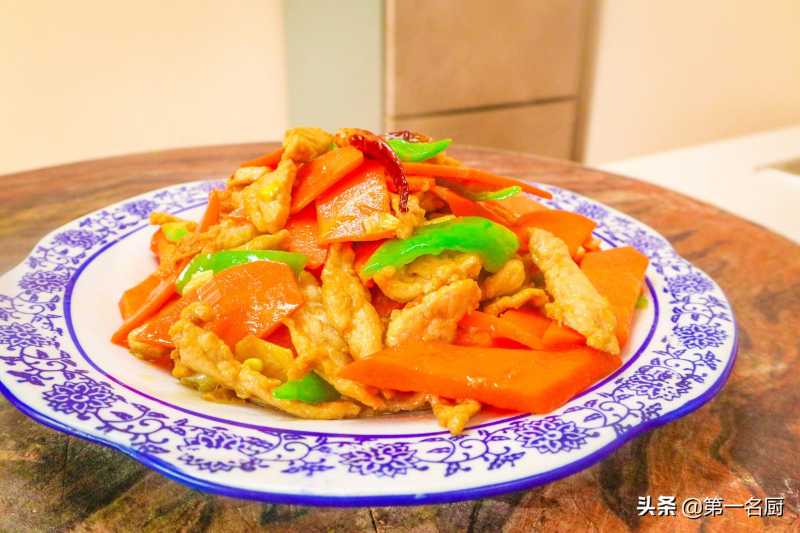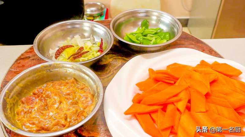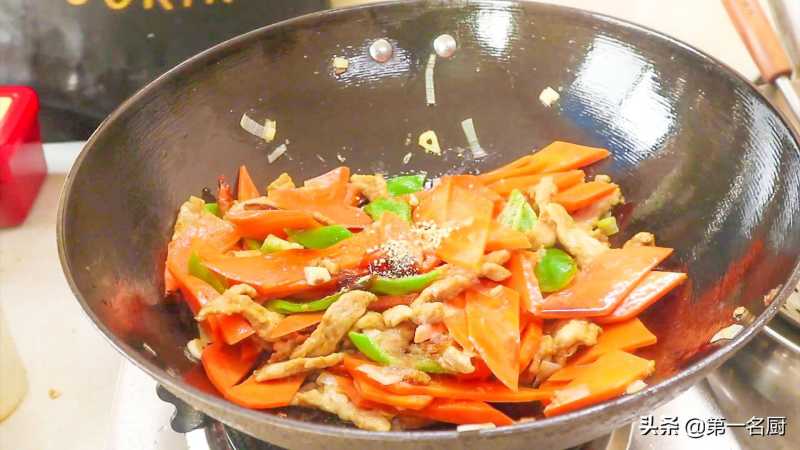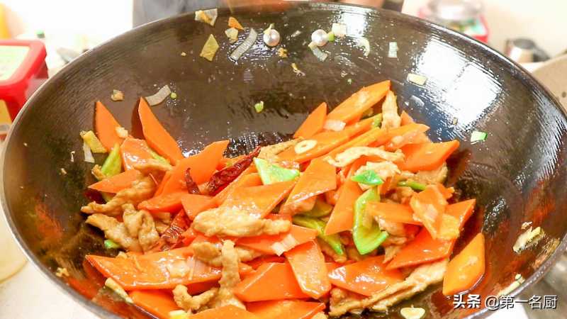 重新起锅添入食用油,放入葱姜蒜和红干椒爆香,再下入肉片翻炒,倒入胡萝卜继续翻炒10秒钟,倒入青椒片翻炒均匀。