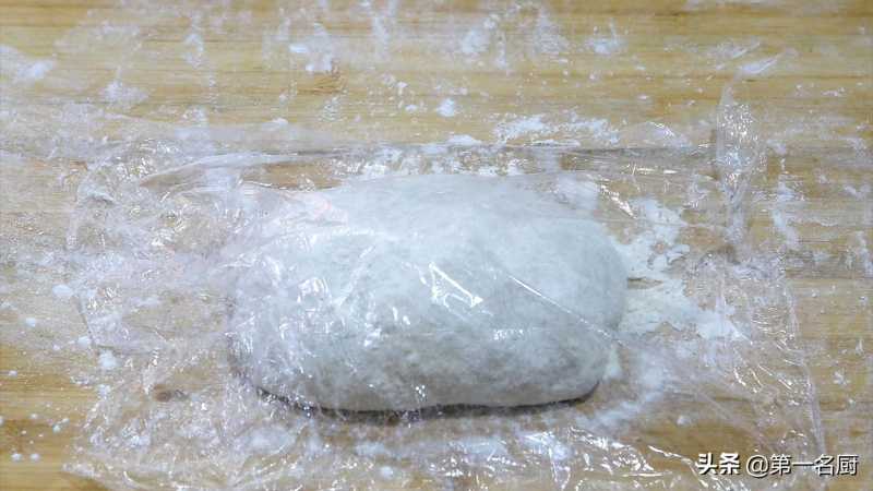 1个小时过后,先在案板上撒上适量的干面粉,再取出醒好的面团,用手揉搓几下,排出里面的气体,盖上保鲜膜,二次醒发5分钟。