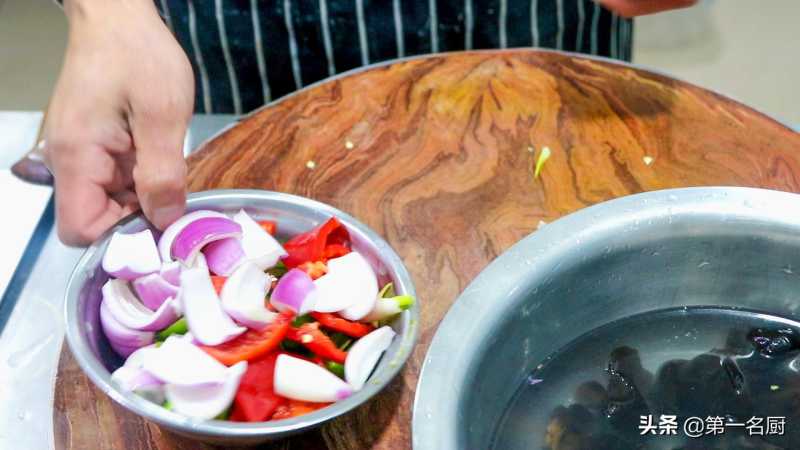 青椒两个去瓤切成菱形片,红椒半个切成三角片,洋葱半个切成小片,泡发好的黑木耳一小把,用手撕成小片,沥干水分放入另一个盆中。