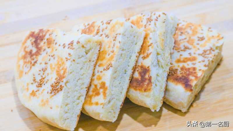 食用的时候,可以用刀切成四半,这道外酥里嫩的燕麦发面饼就做好了。