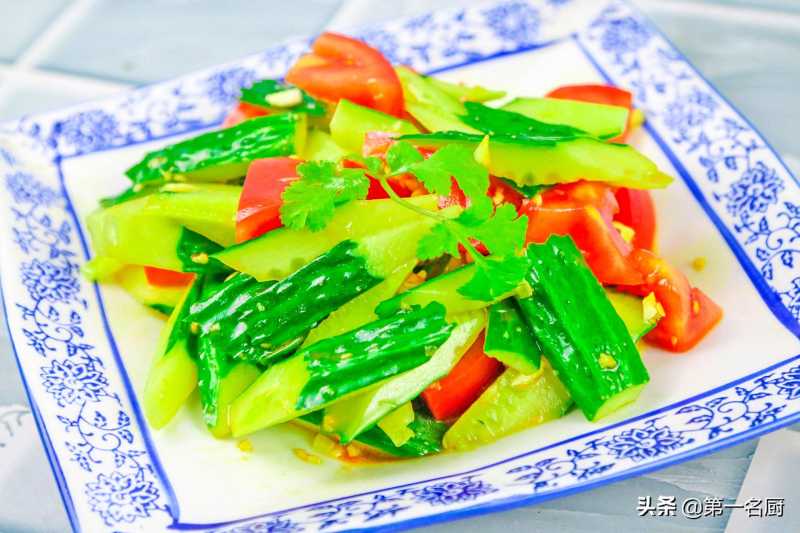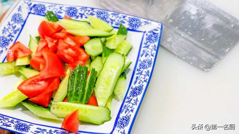 洗净的黄瓜一根,先切去头尾,一分6半,去掉一部分内瓤,再斜刀切成段,放入盘中备用,西红柿一个从中间切开,去掉根蒂,切成滚刀块,和黄瓜放在一起。