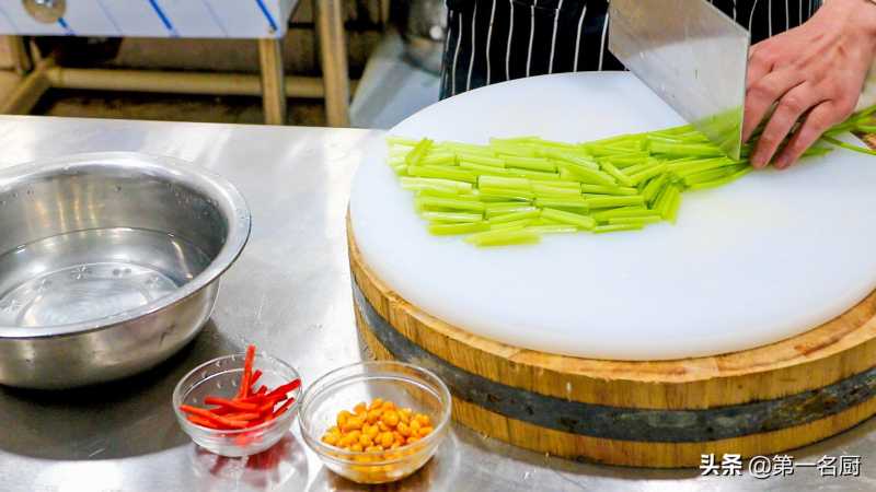准备芹菜半斤左右,五香黄豆一小把备用,红椒半个切成长条,放入碗中,洗净的芹菜一小把,把宽一点的芹菜条,从中间划开,再切成三厘米长的段,放入水盆中备用。