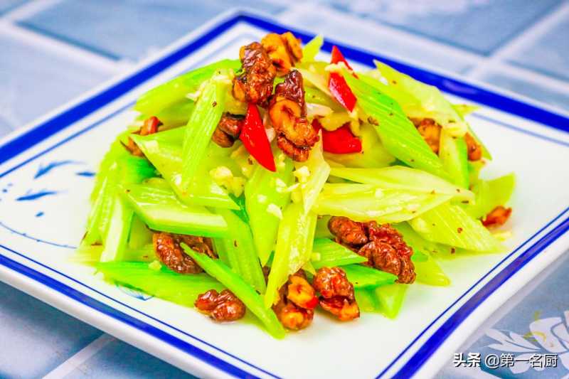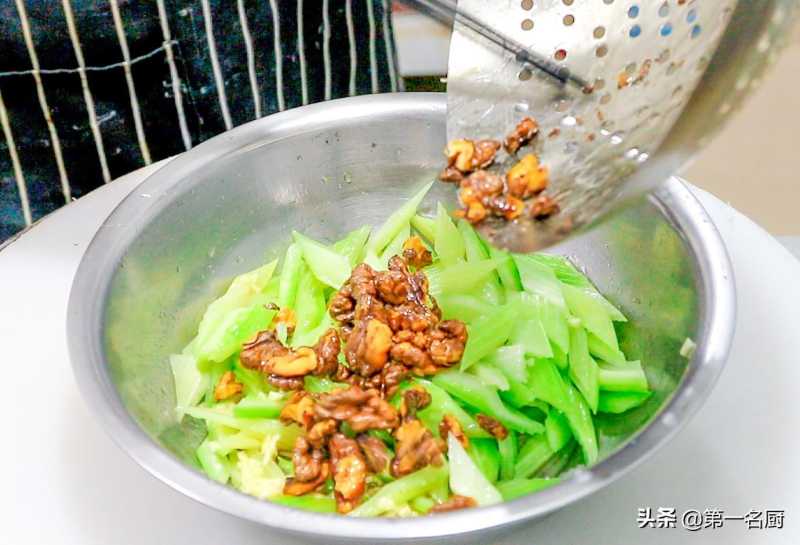 取一个拌菜盆,倒入蒜末,加入食盐2克,味精1克,白糖1克提鲜,白醋5克,香油2克,倒入焯水后的西芹和红椒,用筷子搅拌几下,再倒入炸好的核桃仁,颠盆拌匀,美味即成。