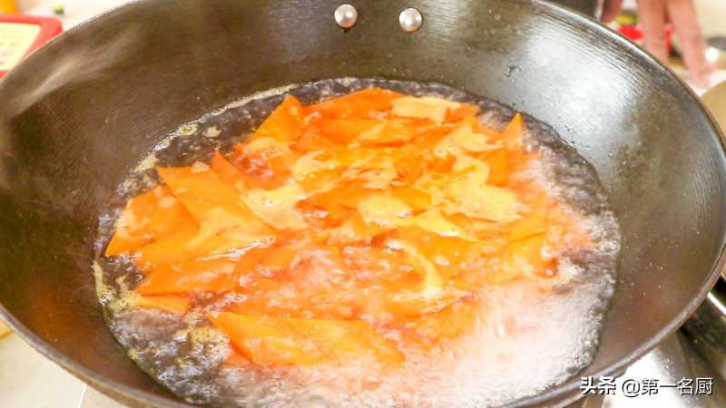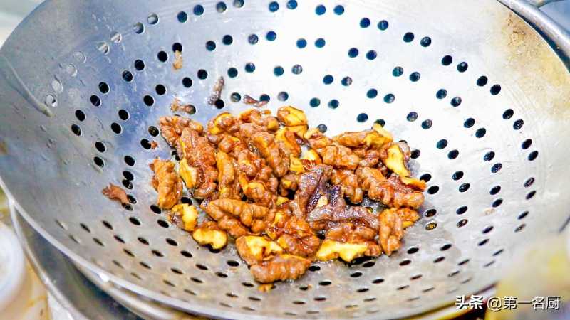 另起锅倒入食用油,把核桃仁凉油下锅,开中小火,用勺子不停地翻炒,炒至核桃仁酥脆即可,这个过程大概需要30秒左右,炸酥以后倒入漏勺中控油。