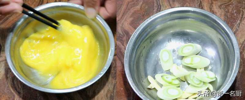 小盆里面打入3个鸡蛋,加入少许食盐入底味,再加入几滴香醋去腥增香,然后用筷子搅匀打散,大蒜几粒切成蒜片,大葱一段切成马蹄块备用。