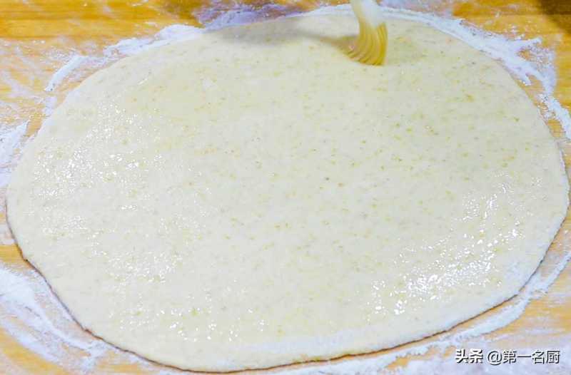 5分钟过后,把面团擀成薄一些的面皮,刷上一层植物油,撒上少许椒盐提味,先从一边慢慢卷起来,卷成长条状,然后从另一端卷起,把另一端压在下面,用手按成圆饼,再擀成圆形的面皮,盖上保鲜膜,避免面饼风干。
