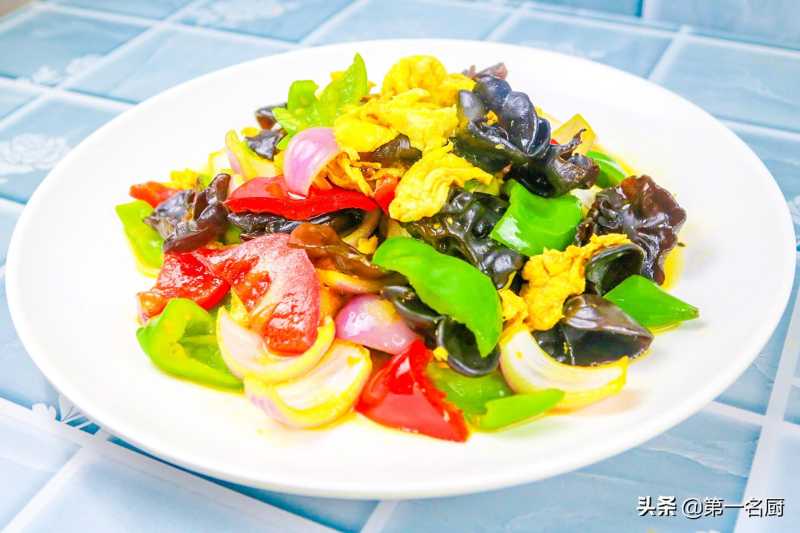 炒锅烧热添入食用油,油热后倒入鸡蛋液,用勺子搅动,等鸡蛋凝固后,倒出控油,再添入少许食用油,倒入葱蒜爆香,倒入青红椒和洋葱,快速翻炒,加入生抽调味,再倒入泡发好的木耳,快速翻炒几下。