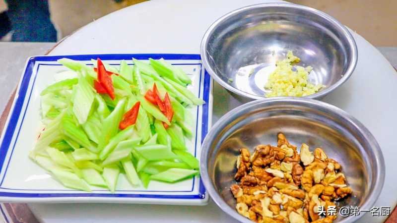 西芹一把撕掉老筋,把宽一点的西芹,从中间划开,再切成菱形块放入盘中,红椒半个切成菱形块,和西芹放在一起,核桃一把,剥去外壳,把果仁放入小盆里面,大蒜几粒,依次拍扁切成蒜末,放入盆中备用。