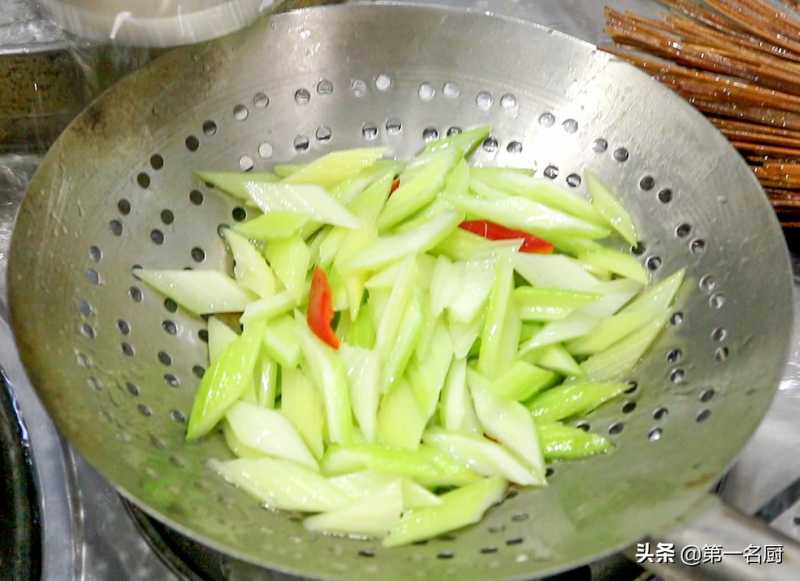 锅中添入适量的清水,加入一勺食盐增加底味,再加入少许植物油,水烧开后,下入芹菜段,用勺子翻动几下,使食材受热均匀,等水再次沸腾后,即可捞出控水拔凉,这个过程大概要一分钟左右。