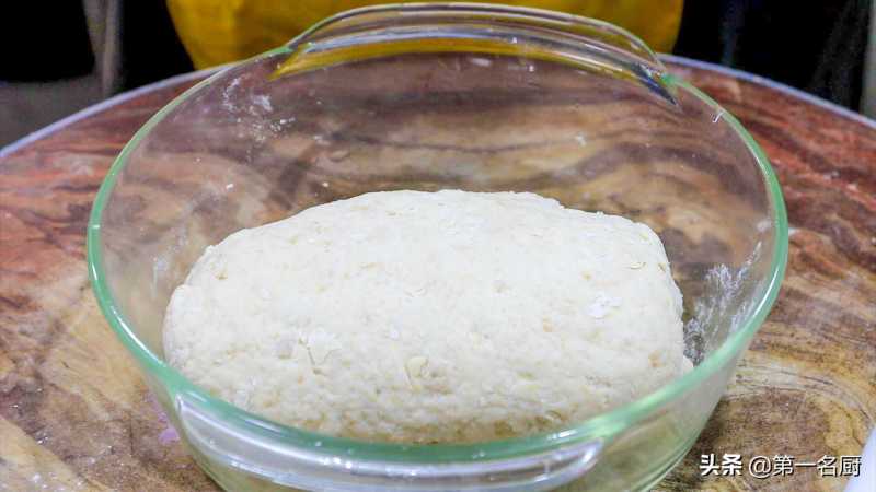 然后倒入一个盆中放凉,加入酵母粉3克,白糖20克,加入面粉100克,先用筷子搅成面絮,再加入少许植物油,用手揉成软一点的面团,盖上保鲜膜,放在一边,醒发1个小时。